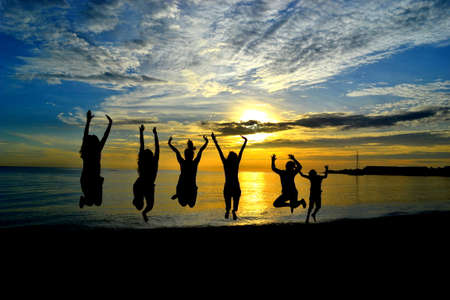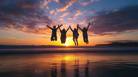A happy family jumping together on the beach, silhouetted against a vibrant sunset sky.