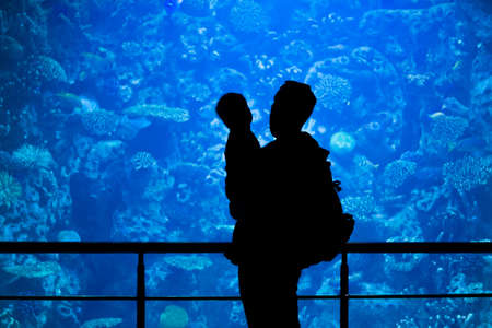 Silhouettes of family watching underwater life. Father and son in the big aquarium