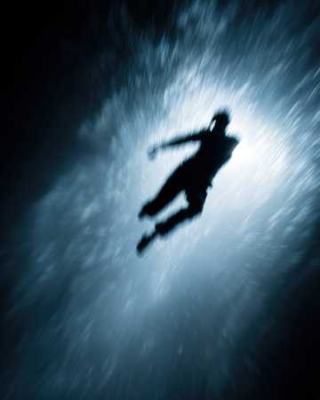 A silhouette of a diver descends into the depths of the ocean beneath a swirling, dramatic sky. The scene is dominated by shades of blue and gray, with dynamic cloud formations. This image evokes feelings of exploration and adventure, suitable for various editorial and commercial applications.