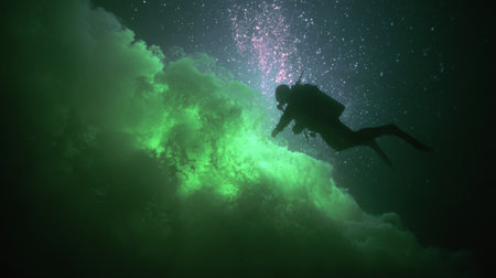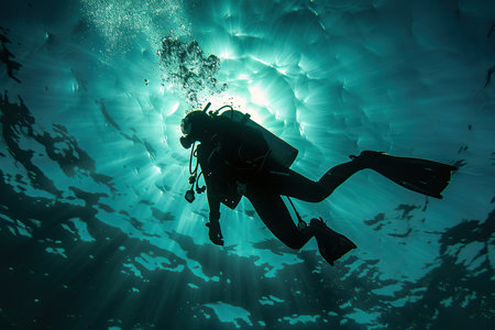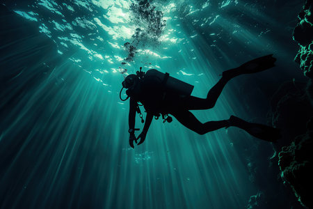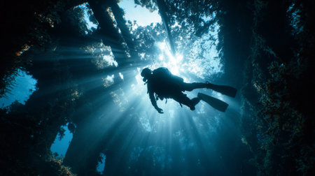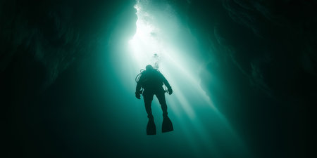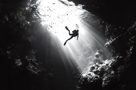 Sunbeams illuminate a scuba diver exploring a dark underwater cave, creating a dramatic contrast between light and shadow in the depths of the ocean