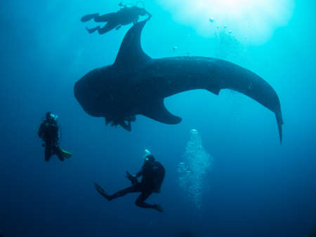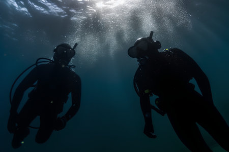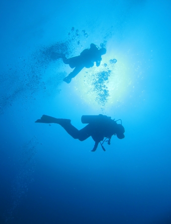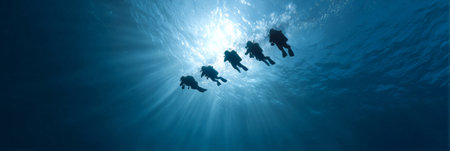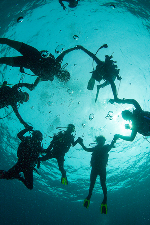 Group of Scuba Divers underwater silhouettes against sun