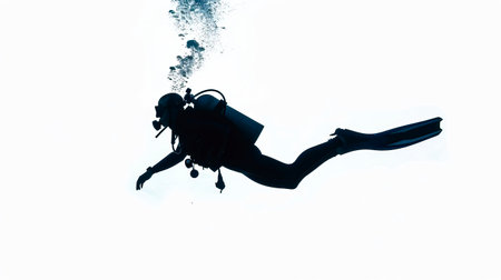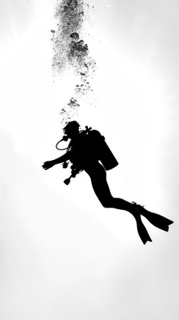 Silhouette of scuba diver diving in water on white background