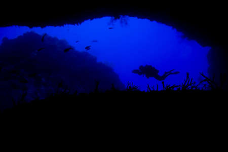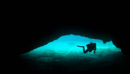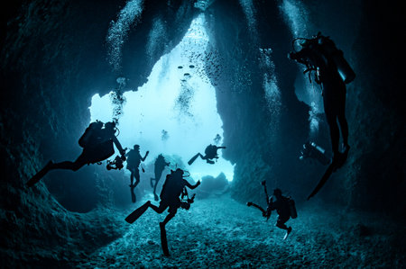 silhouette of scuba divers diving in dark cave. silhouette of scuba divers diving in narrow dark cave under the sea in deep sea concept of active outdoor lifestyle and underwater adventure