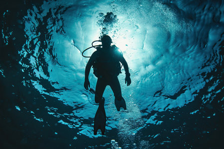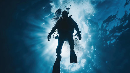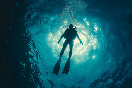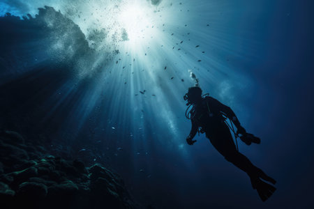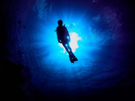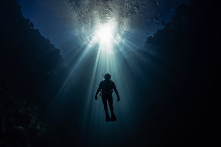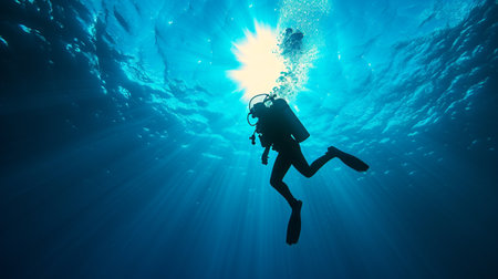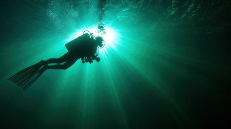Silhouette of a scuba diver underwater in the rays of light