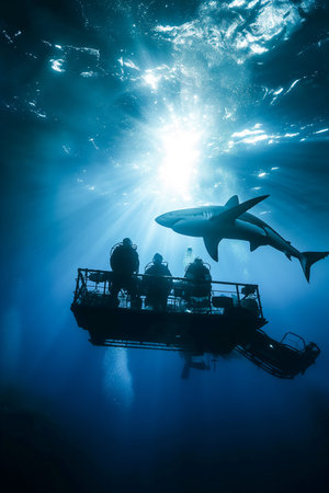 A shark is swimming in the ocean next to a boat with people on it. The people are wearing scuba gear and seem to be observing the shark. Scene is adventurous and exciting