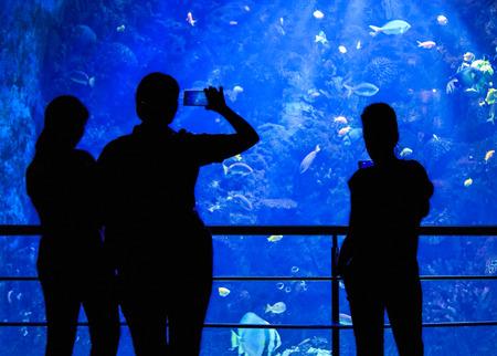 People watch the fish in a large aquarium. Silhouettes of people against the background of a blue aquarium.