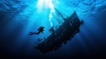 A scuba diver explores an enchanting sunken shipwreck beneath the ocean, illuminated by rays of sunlight filtering through the clear blue water, creating a serene atmosphere.