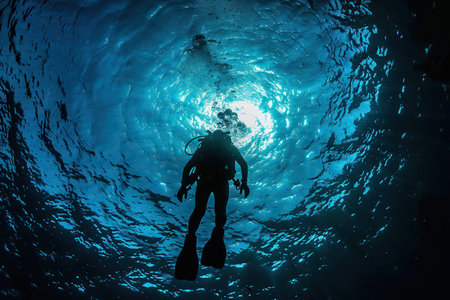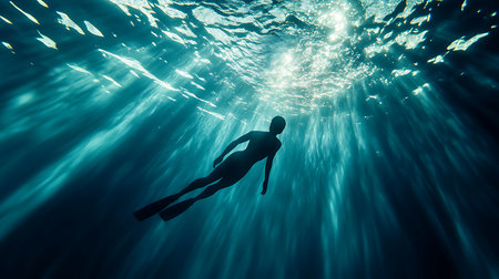 diver descending into the deep blue sea, with sunlight filtering through the water.