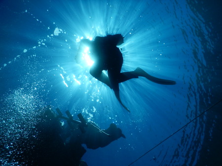 group of people diving holding onto a line while they make a decompression stop, the sunlight illuminates the surface of the blue and turquoise water and cuts the silhouette of the scuba divers
