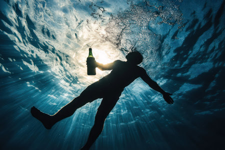 Dramatic concept art showing silhouette of a man inside a bottle, symbolizing alcohol addiction and personal destruction.