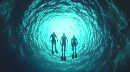 Three snorkelers gracefully glide through vibrant water, surrounded by swirling blue hues, exuding joy in this underwater adventure. The ambiance is serene and captivating.