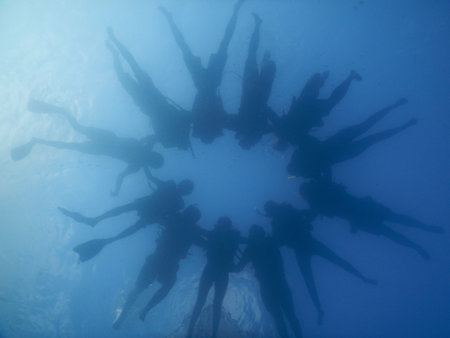 Silhouette of a group of divers at the bottom of the sea