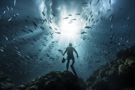 Scuba diver descends into the deep blue ocean, surrounded by a swirling school of fish, creating a mesmerizing underwater scene with air bubbles rising towards the rippling surface