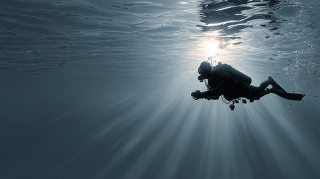 Silhouette of scuba diver underwater with sunbeams.