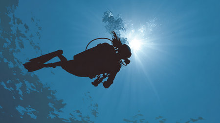 Silhouette of scuba diver against blue sky with sun rays