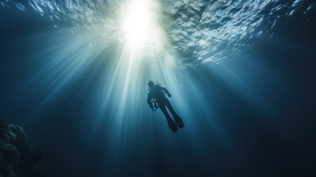 Underwater Adventure Scuba Diver Exploring Depths with Sunlight Rays.
