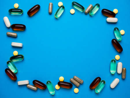 Colorful medicine pills and capsules on blue background.
