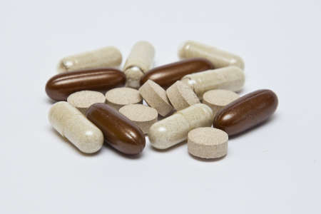 Different pills capsules pills on white isolated background