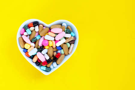 Colorful medicine pills, tablets and capsules in heart shaped bowl on yellow background. Copy space
