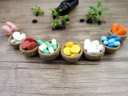 Herbal capsule from herbs nature, good health, vitamin, mineral supplement pills for medicine disease on wooden medical background with copy space, medicine and medicine