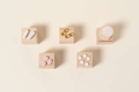 stack of pills arranged on wooden cubes on beige background