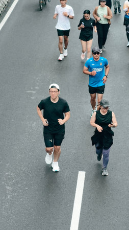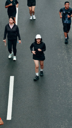Jakarta, Indonesia - Februari 1, 2026: People running and jogging during Car Free Day event at Sudirman street, showing healthy lifestyle, urban fitness activity, and active commun