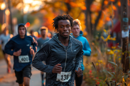 A vibrant scene captures a group of male runners in a competitive race, showcasing determination and energy. The warm sunlight bathes the street, highlighting their focused expressions and athletic attire as they push towards the finish line.