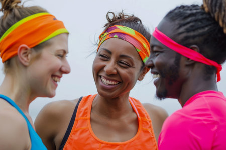 Diverse group of friends in athletic wear sharing a joyful moment together