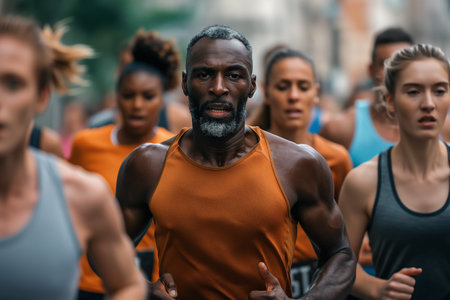 Diverse group of urban runners in motion during a marathon race through the city streets, showing the active and healthy lifestyle of men and women athletes wearing sportswear