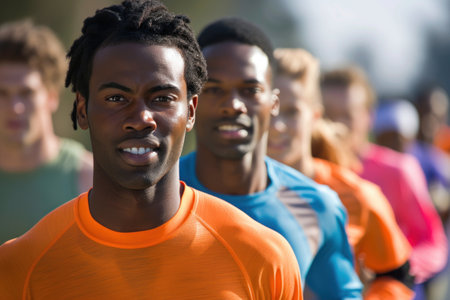 Runners focus intently at the starting line during an urban marathon. The sun shines brightly as they prepare to compete, showcasing determination and athleticism.
