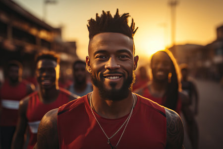 Three runners are participating in a competitive outdoor race. The front runner, wearing colorful attire and sunglasses, smiles brightly as he leads the group on a sunlit day in an urban environment. Generated AI. This is a fictional character not a real person