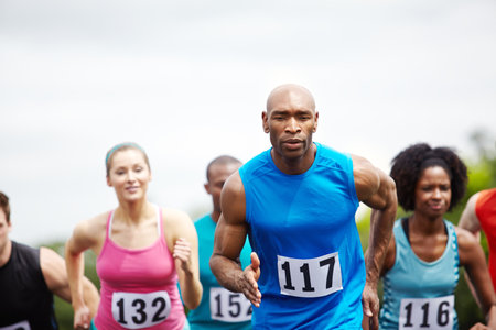 Excited winner, people and sport marathon outdoor with competition energy, race celebration and club pride. Men, group or diversity runner with fitness portrait, sports passion and contest champions