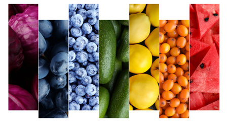 Top view of rainbow composition of various colorful fresh fruits isolated over white background
