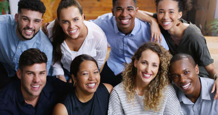 Young and successful. Group of multiracial people working together smiling at camera during business meeting in office. Top view of happy people in elegant casual clothes standing near row of chairs.