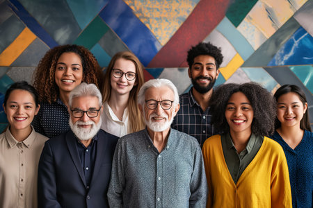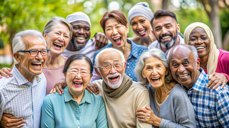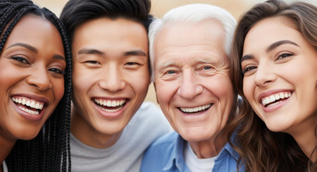 Showcases a diverse group of people from different races. Celebrates multiculturalism and inclusiveness. Shows the beauty of unity in the diversity of different age groups.