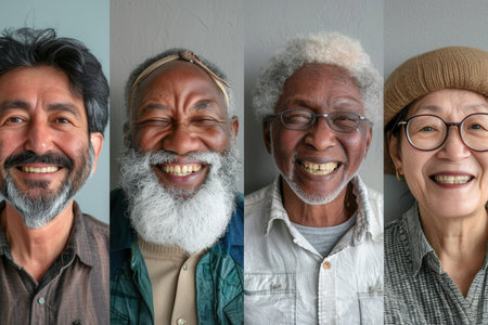 Four elderly individuals with diverse features share warm smiles against a neutral background, highlighting their happiness and connection.