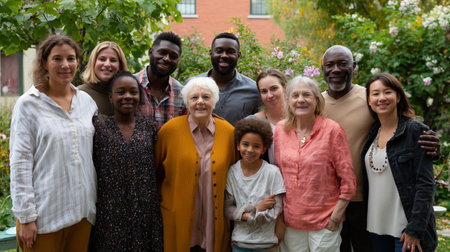 Family gathering in a garden with diverse members enjoying quality time together