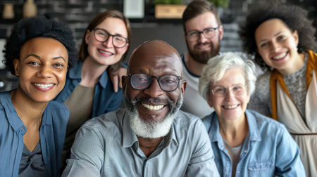 Smiling individuals of diverse backgrounds posing together in a warm and welcoming scene