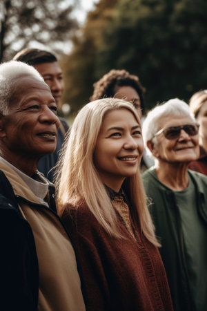 A diverse group of individuals stands in close formation, reflecting unity among various ages and ethnicities, creating a powerful sense of togetherness and inclusion.