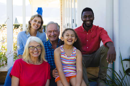 Portrait of cheerful multiracial multigeneration family sitting outside house in yard. Happy, unaltered, togetherness, love, childhood, retirement and lifestyle concept.