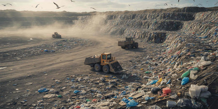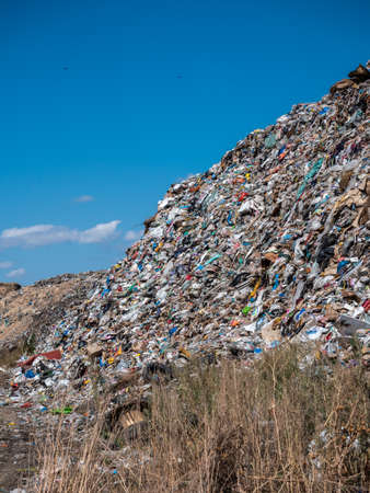 Landfill waste disposal. Garbage dump with waste plastic and polyethylene. Garbage truck unloads rubbish in landfill. Reduce greenhouse gas emissions and methane emissions. Environmental protection.