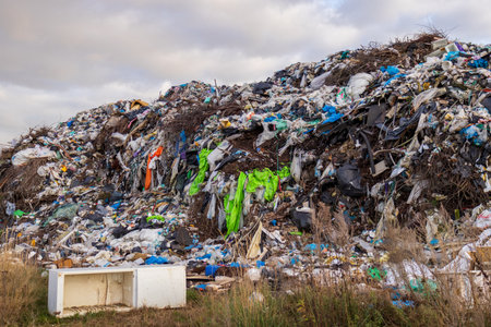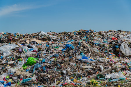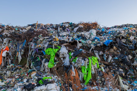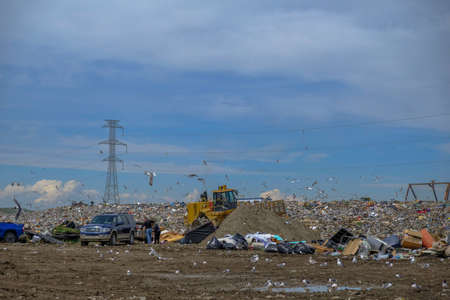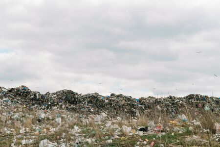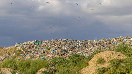Garbage dump with plastic bags and food waste. Recycling of waste on junk yard. Dispose the rubbish in landfill. Trash disposal and rubbish dump with polution. Ecology, refuse and natural resources