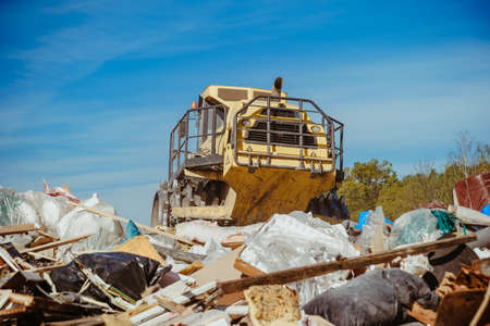 Yellow tractor works on huge landfill of big city. A lot of garbage on dump. Waste sorting on dumping site.