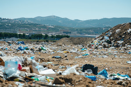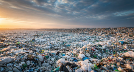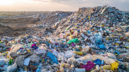 Plastic debris covers the ground in a vast landfill site with large mounds of waste rising against a cloudy afternoon sky showcasing the environmental issue of pollution.