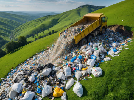 A garbage truck unloads a massive pile of waste into a lush, rolling countryside. The stark contrast between the pristine landscape and the pollution illustrates the careless impact of illegal dumping on the natural world.