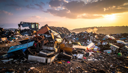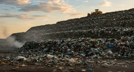 Mountains of waste rise at sunset, showcasing pollution and environmental concerns.