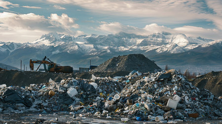A vast landfill site full of various types of waste, including plastic, clothing, and other debris, highlights pollution and ecological issues.