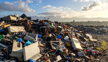 A sprawling electronic waste dump in an open area, filled with broken gadgets and appliances under a gloomy cloudy sky. No people.