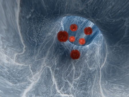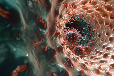 Microscopic view of a virus inside the bloodstream, AI Generated. Ideal for medical education and health awareness campaigns.