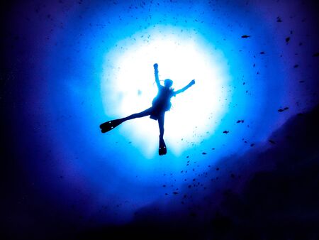 The silhouette of an attractive slim woman under water. The beauty of the ocean world. Ideal background for the different kinds of marine collages and illustrations in blue shades.